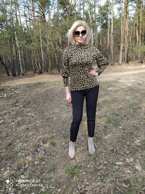 Bluzka uszyta z dzianiny takiej trochę punto, choć bardziej szlachetnej, wzór jak widać w panterkę, model na podstawie Burdy 9/2019.