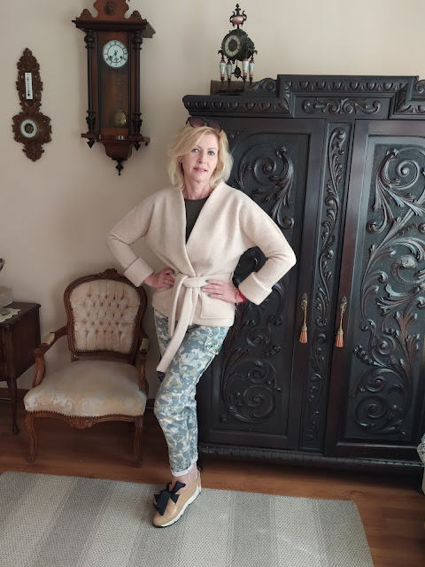 Skusiłam się, moro takie jesienne, ale niby nie widoczne, można połączyć ten wzór ze wszystkim kolorami, można sobie dobierać górę według potrzeb. Ja raczej spokojnie co nie oznacza końca moich stylizacji na ten temat, spodnie mają potencjał. Materiał kupiony tutaj: SKLEP, obecnie nie ma na stanie a wielka szkoda bo jest bardzo fajny, naturalny, bawełna elastyczna, szyje się świetnie.